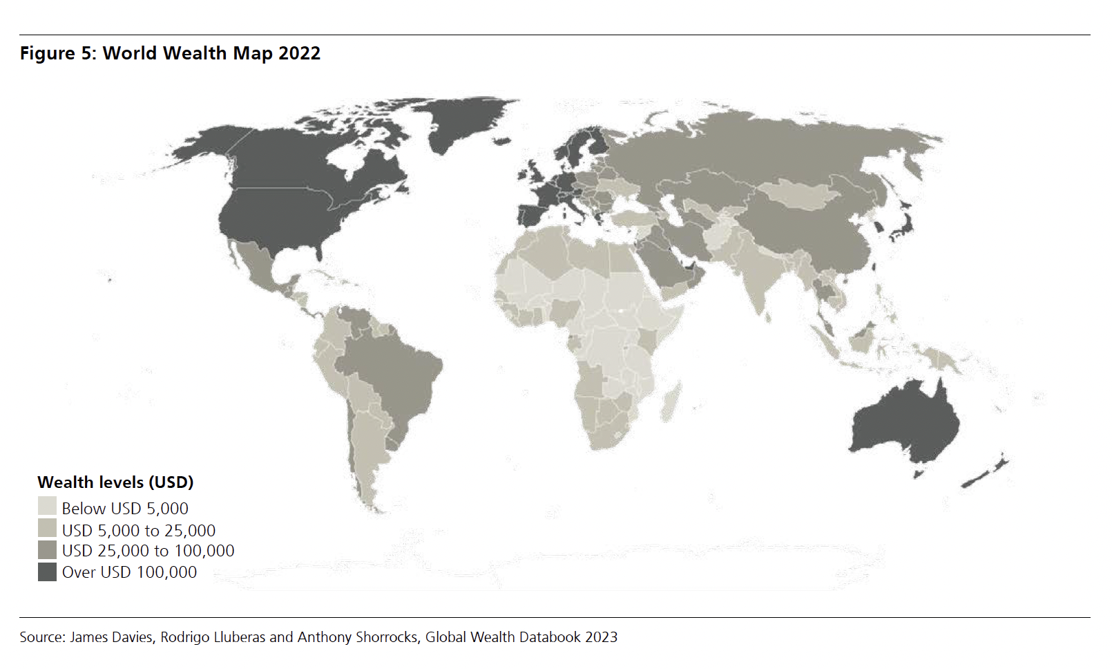 “North America and Europe together account for 56% of total household wealth, but contain only 16% of the world adult population. The wealth share in the Asia- Pacific region (excluding China and India) is quite similar to its share of adults and the same is true for China. But the adult population share is more than double the wealth share in Latin America, five times the wealth share in India and ten times the wealth share in Africa.”